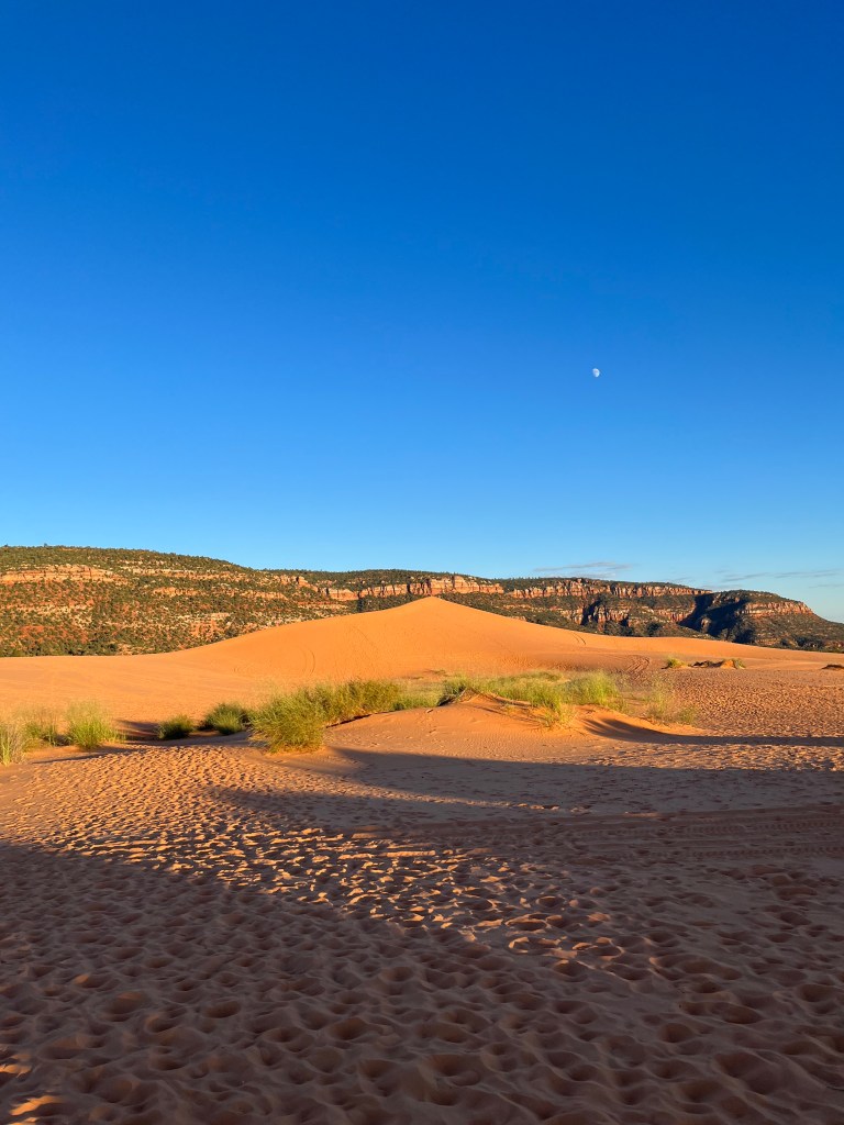 To make the most of our trip, we decided to stop at The Coral Pink Sand Dunes, which is an absolute must if you’re ever in Southern Utah! I could not recommend it more. We arrived in the evening and made a pit stop there before heading to our hotel in Kanab for the night.