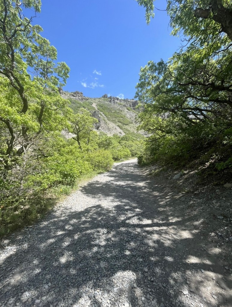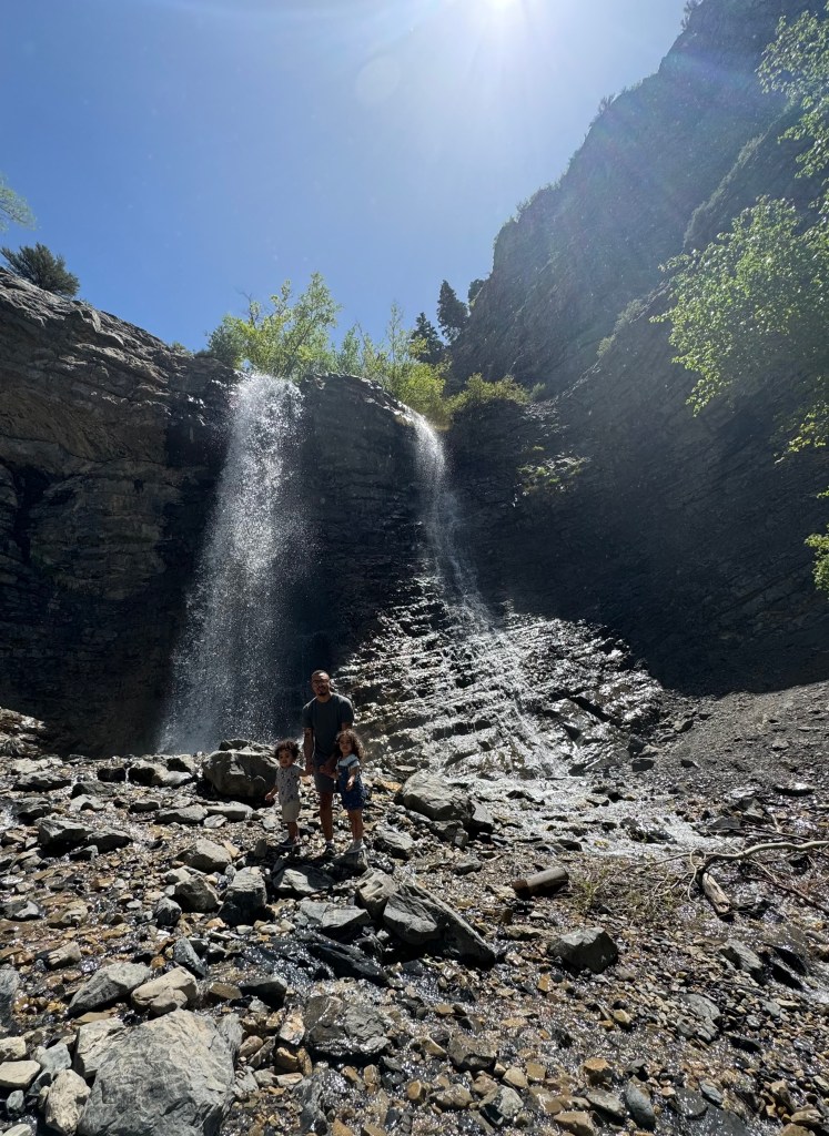 The longest and most strenuous of all trails I’d recommend can be found in Provo Canyon near Aspen Grove, Utah. This hike leads to the most beautiful waterfall, but takes approximately 2+ hours, depending on you and your family’s abilities. This was our children’s very first hike since moving to Utah so they weren’t accustomed to it whatsoever. This impacted the time it took for us to complete it as we carried both of our toddlers the entire way. I would definitely only recommend this hike if done with older children who enjoy hiking and can make it entirely on their own. Luckily, though, the trail is very well shaded, so we at least had that going for us. 😉