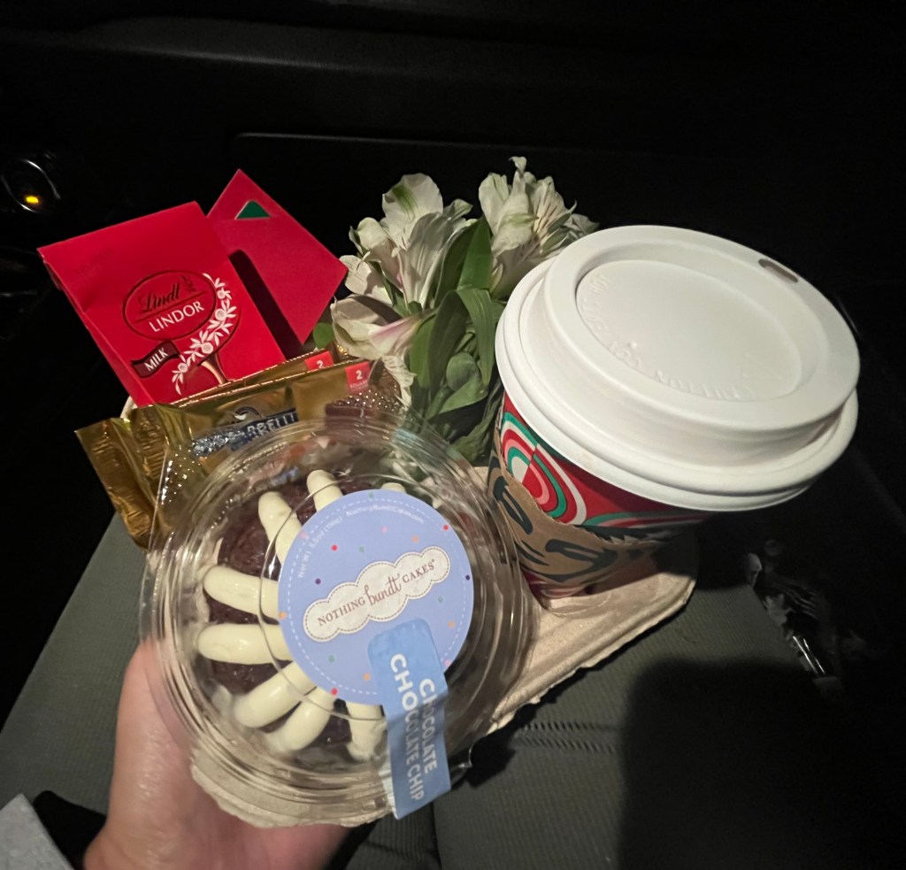 For mine, I included my SIL’s favorite Starbucks drink, a Starbucks gift card, a small bouquet of flowers from Target, a single chocolate chip Nothing Bundt Cake, along with a few chocolate candies and birthday card. The options are endless, so you can truly customize it to whatever your gift recipient enjoys.
