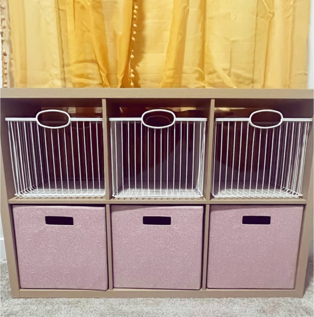 Because my kids have several toys, but they are mostly small (magnatiles, blocks, play food, dinosaurs, etc), I opted for a 6-cube shelf with individual cubes measuring at 13″x13″X14″. I picked up a 3 heavy duty metal wire baskets for the upper cubes and collapsible fabric bins for the bottom cubes.