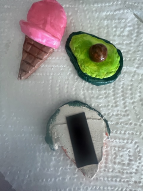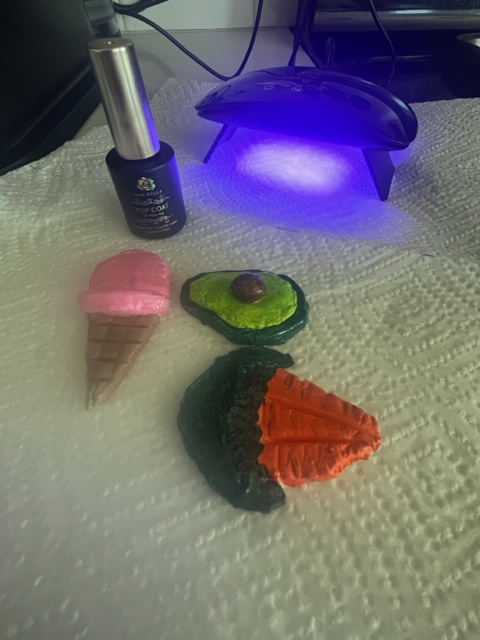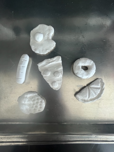 I found a few inspo pics of food clay magnets to reference and did my best to emulate their shapes, using a bit of water to bind multiple pieces.