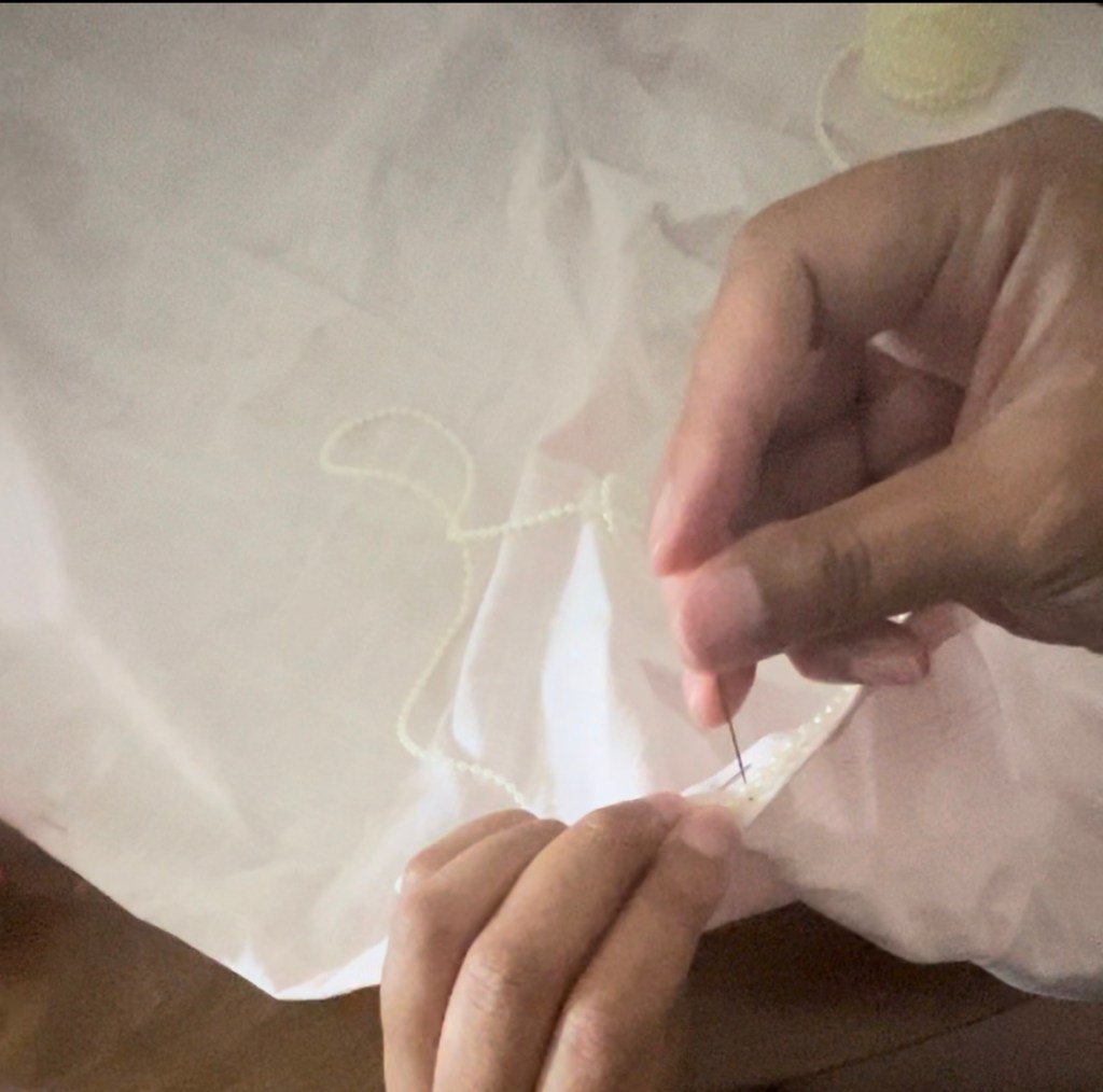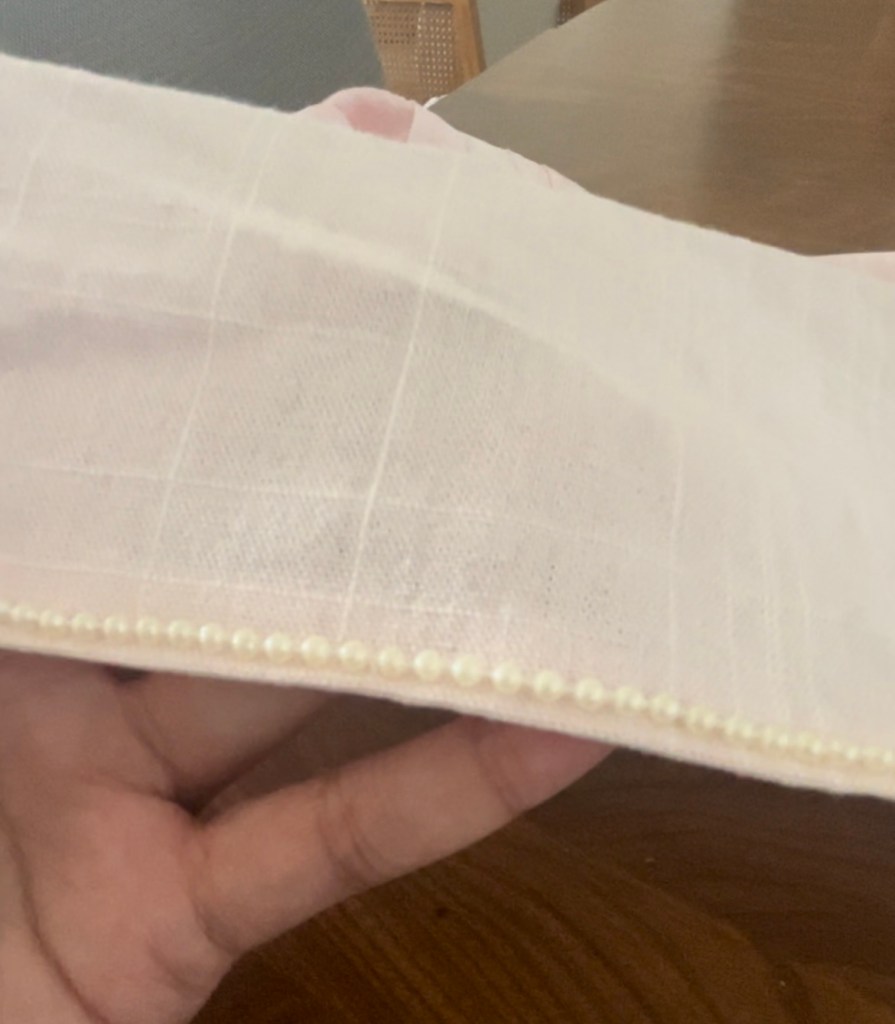 After I cut my fabric, I hemmed the bottom by folding over the bottom of the panels (about half an inch) and hand-sewed across to create a clean and solid edge. Once I had completely hemmed both panels, I used a spool of pearls to attach to the border, similar to what is seen in the inspo-pic.